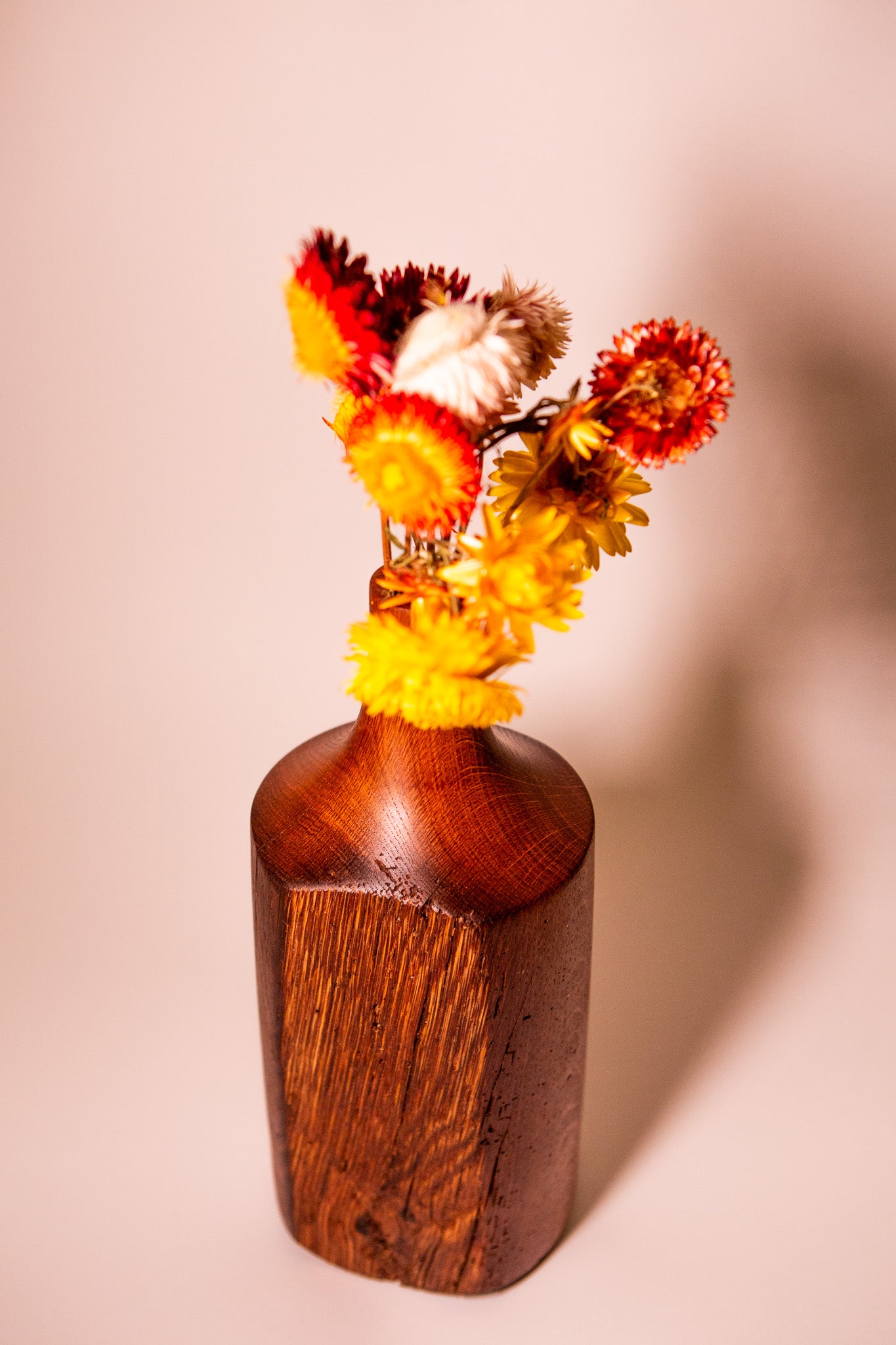 This unique vase is crafted from reclaimed oak wood sourced from a barn built in the 1600s, believed to have originated from an old ship. The wood is estimated to be over 600 years old, adding a touch of history and character to the piece.