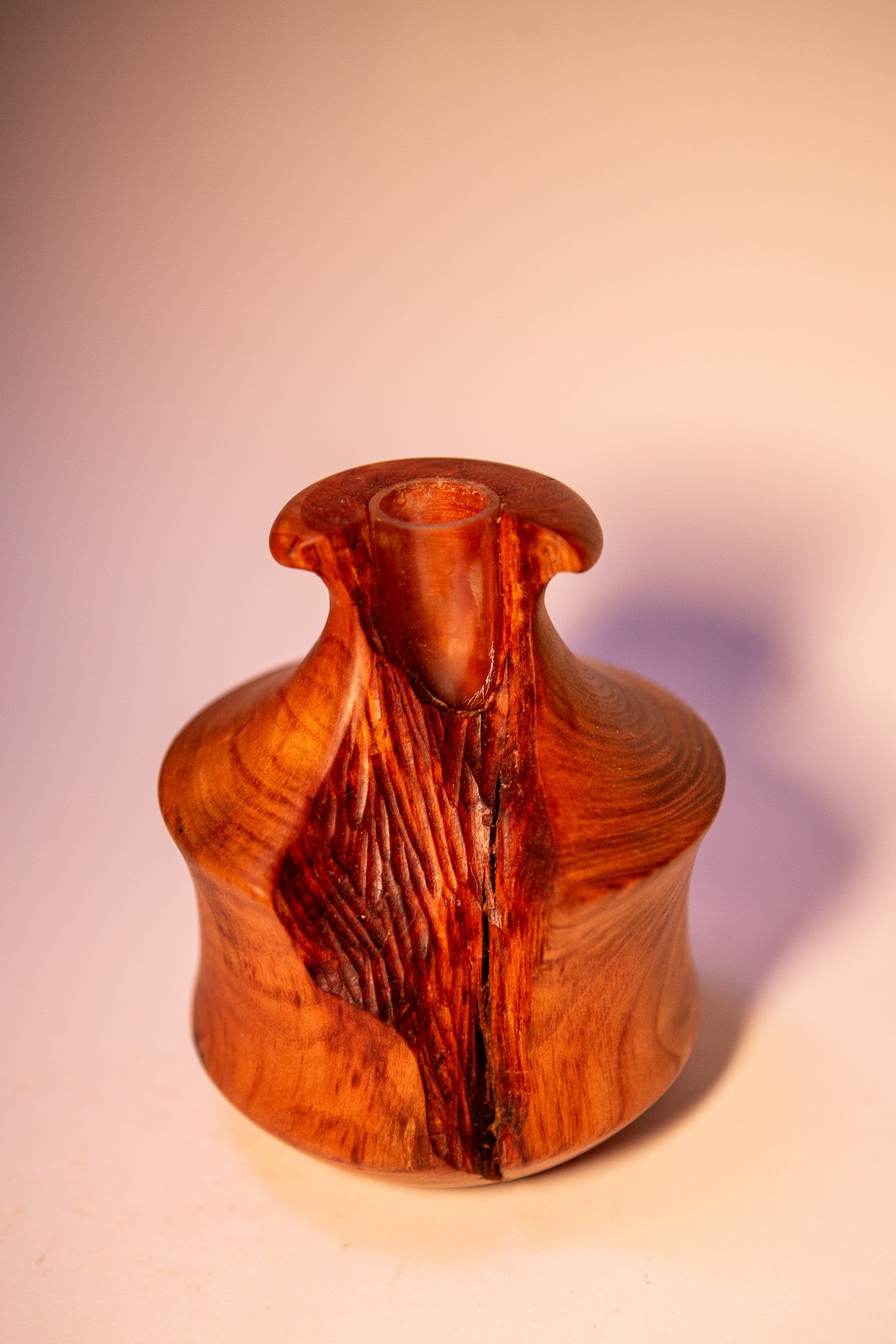 This unique cherry wood vase was crafted from a piece of reclaimed wood that had rotted areas. The rot was carefully carved away, revealing a beautiful natural feature. An acrylic tube has been securely sealed inside, allowing for the use of water and making it perfect for displaying fresh flowers or greenery.